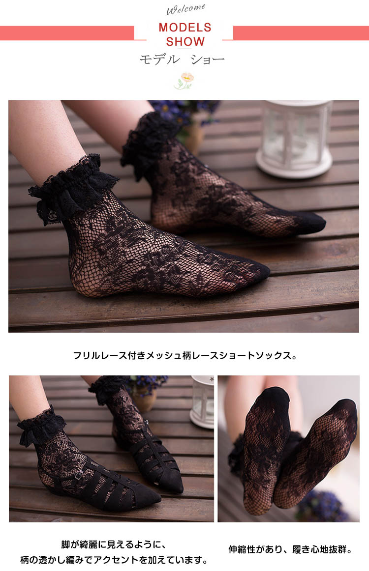 | フリルレース付きメッシュ柄レースショートソックス。脚が綺麗に見えるように、柄の透かし編みでアクセントを加えています。伸縮性があり、履き心地抜群。ガーリーやパーティースタイルに合わせやすいので結婚式などでも大活躍間違いなし♪ロリィタファッションにもオススメです★ | |