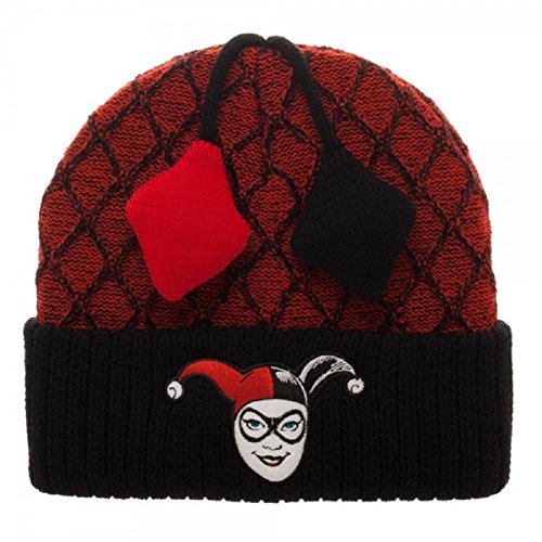 Product DescriptionDc Comics Harley Quinn Diamond Poms Cuff Beanie Hat. Inspired by the original Harley Quinn Jester Costume from the 90s Batman Animated Series design features a knit cuff beanie with plush diamond poms.0
