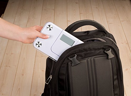 -. Feature : Great for small spaces, this compact digital scale features a pop out display that folds in for storage. / Take the scale anywhere for consistent measurements while traveling or for trips to the gym. / Built to accommodate up to approximately 350 pounds (180 kilograms), this tempered-glass platform is attached to the base with 4 contacts for balance. / Comfortably measure weight with a 9.05-inch by 5.12-inch platform. / Never worry about excessive battery drain with instant on, auto off, and low battery indicator (lithium battery is included).
