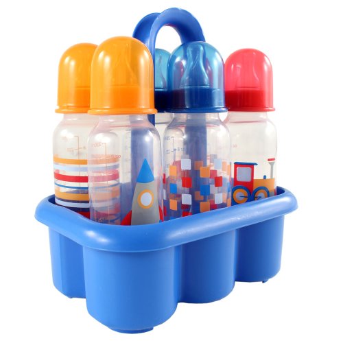 Set includes 6 decorated 8 oz. baby bottles with handy carrier