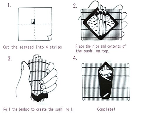 Product Description How to make hand-rolled sushi 1.Cut the seaweed into 4 strips. 2.Place the rice and contents of the sushi on top. 3.Roll the bamboo to create the sushi roll. 4.Complete!