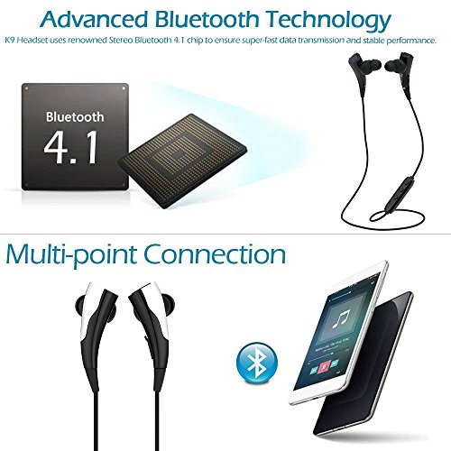 -. Feature : 【Advanced Bluetooth Technology】K9 Headset uses renowned Stereo Bluetooth 4.1 chip to ensure super-fast data transmission and stable performance. / 【Super Sound Quality】K9 Headset uses high-performance Speaker, offering you high-quality audio, letting you greatly enjoy APT-X HIFI stereo sound music & enhanced BASS effect. / 【Convenient to controlling your music and calls】K9 Headset is equipped with function buttons which lets you easily controlling your music. It also supports hands-free with high-grade microphone, thoroughly setting free your hands from answering the call during exercise. / 【Integrated Multi-Point Technology】K9 Headset Can simultaneously connect two smarts phone. So you can seamlessly switch between your business and personal phones. / 【Ultra-low Power Consumption】Up to 5 hours of continuous Music and 5.5 hours of Talk Time, 180 hours of Standby Time per charge cycle.