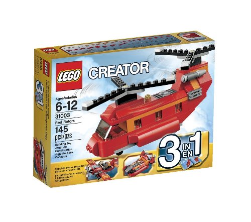 Lower the ramp, load the cargo and taxi to the helipad in the Red Rotors helicopter! With massive twin rotors, no load is too heavy for the heavy-lifting helicopter. Take off from the cool cockpit with a translucent windshield, then touch down on the landing gear to deliver your cargo! Rebuilds into a cool propeller plane or twin-rotor hovercraft.Feature