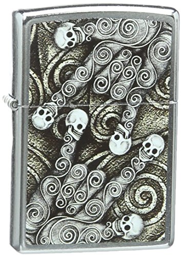 Rock on with this unique street Chrome, lighter. Swirling patterns are layered to create the look of different textures as two hands spread from the top and bottom of the lighter in a Rock on or I love you gesture. Adding to the detail of the design are skulls atop the extended fingers. Lighter comes packaged in an elegant and environmentally friendly Gift box, making this a perfect Gift for anyone on your list. Made in America for more than 80 years, this iconic lighter is both functional and collectible. All Genuine zippo lighters feature a lifetime guarantee that it works or we Fix it for free. Lighter fluid not included. Comes with one flint and wick already installed. Refillable for a lifetime of use; flints, Wicks and fluid are replaceable and sold separately.Feature