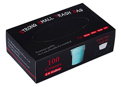 100 counts of 2.6 gallon trash bags,made of High-quality raw materials PE,no smell, no breakable,no leak,more durable,more economical and more environmentally friendly