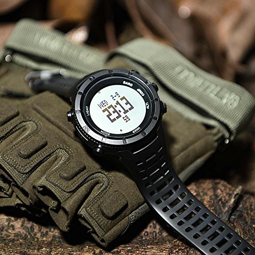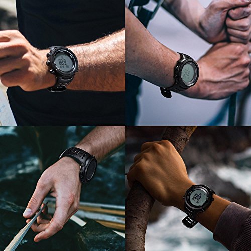 -. Feature : Black hiking sport watch with multiple features including digital Compass, Altimeter, Barometer, Thermometer, EL backlight, World time of 48 cities, 1/100-second Stopwatch, Countdown timer, 12/24-hour formats; / Please be kindly note the watch is in the Sleeping Mode when factory-set, you must relieve the sleeping mode for displaying on the screen. This hiking watch is with 5ATM Waterproof, it is no problems to wear our watch while washing hands, having shower with cold water, swimming, but please do not diving or sauna, and so on; / Changeable Unit Format ---- Date Format(12/24 hour) → Temperature(°C/°F) → Pressure (hPa/inhg)→ Altitude(ft/m); / Classic Outdoor Design ---- High quality material makes it lightweight and comfortable to wear. Large numbers on the dial and with EL Backlight, easy to read, suitable for viewing in dark environment, very convenient; / CR2032 Battery Type and Battery Life in Time Mode ---- 12 months.