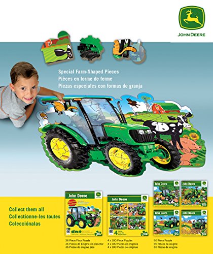 Studio : Masterpieces Puzzle Co. Publisher : Masterpieces Puzzle Co. Binding : Toy Product Description This MasterPieces Friends on a Farm - John Deere 36 inch x 24 inch 36 Piece Floor Puzzle is great for children 3 and up. This giant 36 piece Shaped Floor puzzle has special farm-shaped pieces cut right into it. Can you find the tire-shaped piece? 0