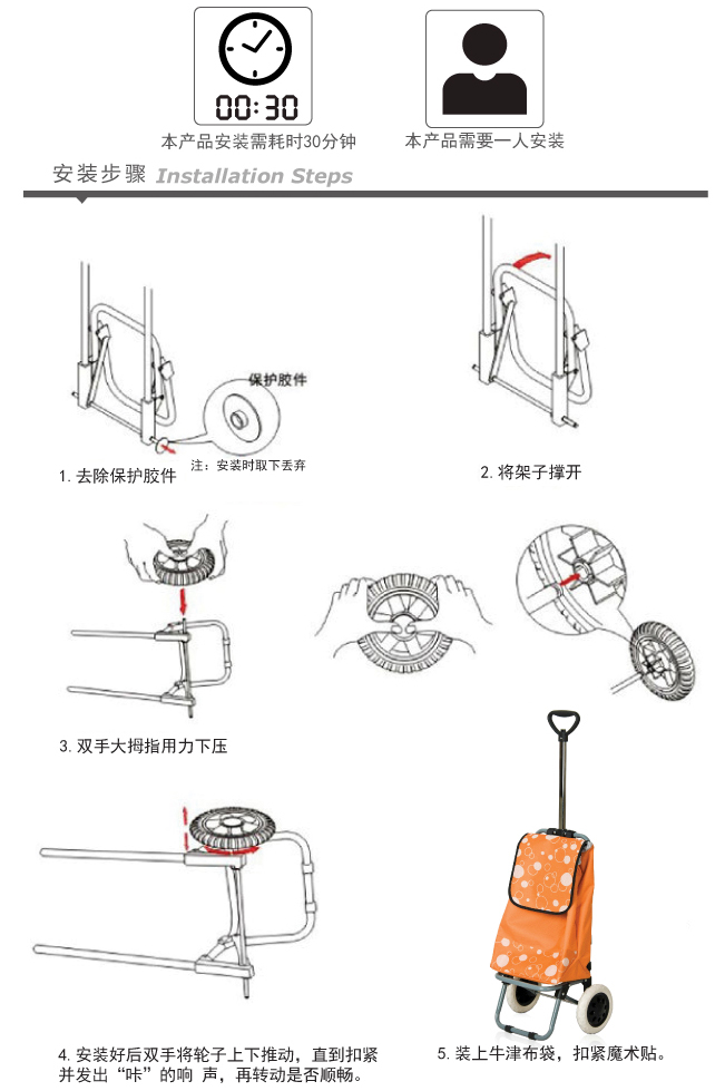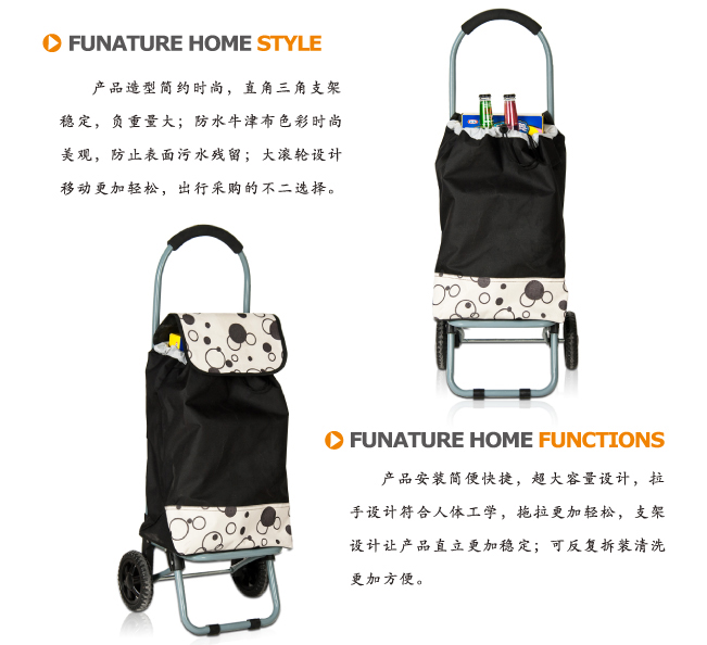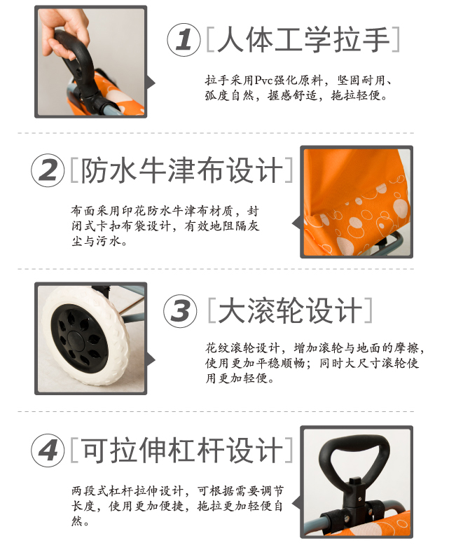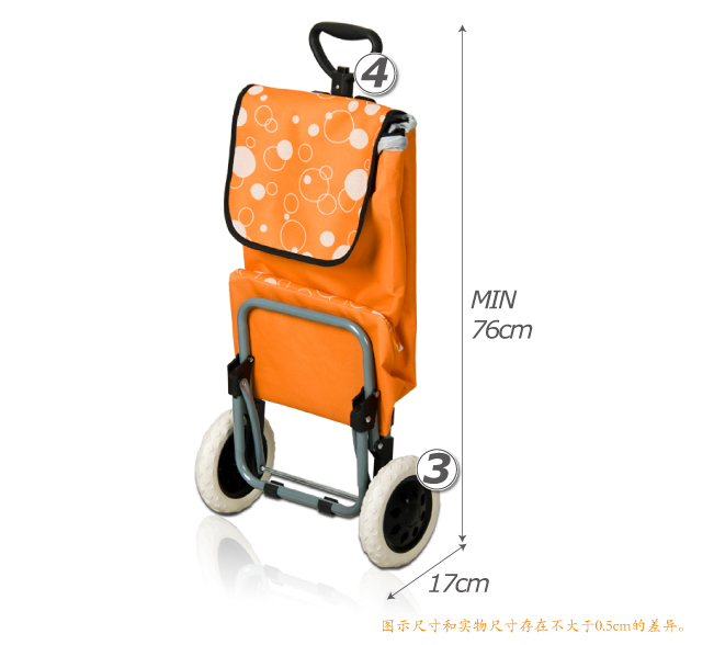 拖着可爱的购物车去购物已经成为了一种时尚,独具特色的拉杆功能使用更方便,你是否也想走在时尚的前端,挑战一下街头购物的回头率呢!为自己买一只携带方便,放在家中又可折叠节省空间的购物车,俏皮可爱又实用不仅可用来购物,同时也可用做放衣服的方便小橱,甚至就是旅行行李车拉!更是送给爸爸妈妈的好礼物。