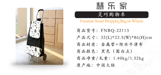 1、结构独特:慧乐家可伸缩拉杆购物车,真材实料坚固耐用。造型结构独特、设计灵巧、装卸简便、洁净亮丽,生活好帮手。