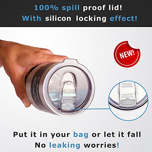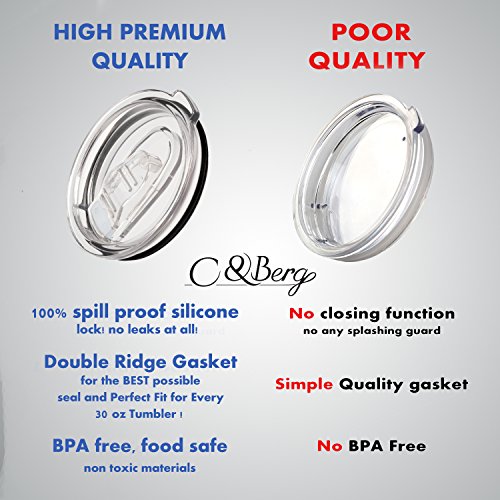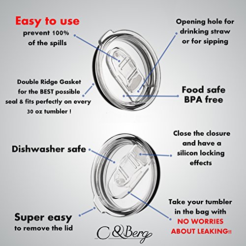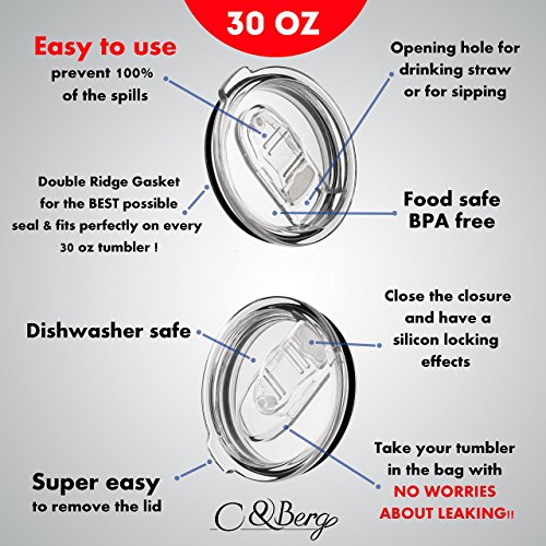 FEATURES: ? Giving you the chance to control the liquid leaking and splashes of your beverage and keep it guard while walking or even driving or traveling while it is in the bag ? Perfect match for any 30 oz tumbler such as Yeti rambler, rtic cooler, ozark trail and more ? Crystal clear plastic with a closure function to prevent 100% of the leaks!! ? dishwasher safe ? Eco - friendly ? BPA free ? Trendy and modern design IDEAL FOR THE BRANDS: Yeti rambler, Rtic cooler, Ozark trail, Simple Modern, SIC, Smart, Greens Steel, Kodiak, Magnum steel and more ------------ EXCLUSIVE WARRANTY ------------ ★ 100% assured results ★ If you are still unhappy with our special 100% spill proof vacuum lids we offer you 30 days money back guarantee, no questions asked! ★ 10% discount coupon for all of our exclusive CBerg tumbler products collection Enjoy the benefits and order the product even for your friends ;) ★SPECIAL GIFT★ A FREE SPECIAL EBOOK - "Juice Master" -Special smoothie recipes for your 30 oz tumbler!