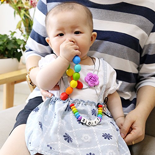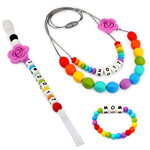 Accmor Rainbow“2017” Teething Necklace, “I LOVE 2017” Pacifier Clip, “WOW” or”MOM” Teething Bracelet Set Rainbow-Series Meaningful and Stylish Silicone Baby Teether Toys BPA-Free