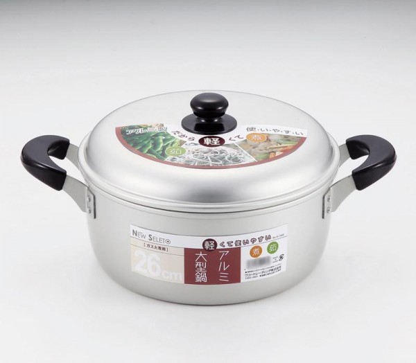 アルミ鍋は熱伝導が高く、同サイズの鉄製鍋に比べて軽くて使いやすいのが特徴です。表面は薄いアルマイト被膜を作る処理(アルマイト加工)を施してあるので酸化・腐食しにくく、光沢も長持ちします。 |