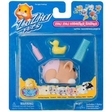 Here comes baby Pumpkin, the newest addition to your child's Zhu Zhu Pets hamster babies collection. A roller ball beneath the tummy of this Zhu Zhu baby hamster pet enables it to roll easily. Pumpkin comes with a pink diaper and other essential baby hamster accessories: a shampoo bottle, feeding bottle and a play duck. This Zhu Zhu Babies play set inspires children toward creative role-play and nurturing. Children can learn to take care of Pumpkin just like a real pet. Pumpkin got her name because she was born on Thanksgiving. Fall is definitely her favorite time of year because she loves to play in the leaves! Outside is home for this playful hamster. Pumpkin is a beige baby with white paws and a pink diaper, which houses her birthmark. Ages 4+Feature