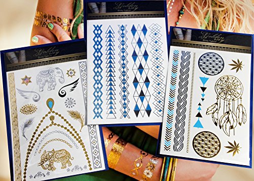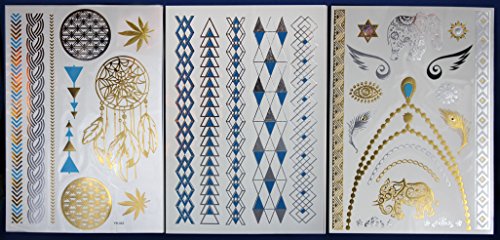 Golden Ray Metallic Temporary Tattoos Skin Body Art - 3 Sheets of Blue, Silver & Gold Jewelry Tattoo /TTIII/