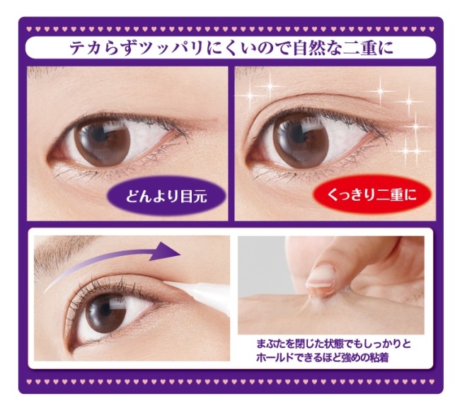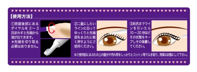 | 使用方法 | ●容器から液が出てくるまでダイヤルを回してください。 ●二重にしたいラインに沿ってゆっくりと先端部をまぶたに軽く押すようにご使用ください。 ●目尻までラインを引いたら10秒ほどその状態をキープし、その後、離してください。 【落とし方】 ●洗顔でやさしくこするように落としてください。落ちにくい場合は、濡らしたコットン等をまぶたにしばらく当てた後、洗顔してください。 |