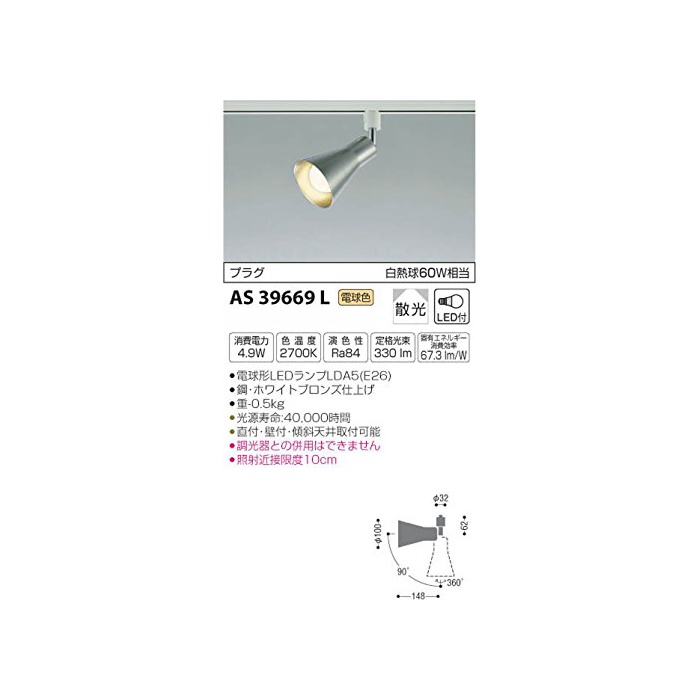 원본상품명: コイズミ照明 スポットライト プラグ 白熱球60W相? ホワイトブロンズ仕上 AS39669L