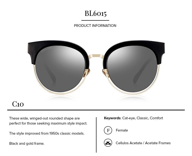 As an improvement over the 1950s classical models, this BOLON new design made from colorful mixed materials highlights the theatrical element, which reflected the new attitudes of women born in 1950s. The timelessBLACK frames CATEYE shape with GREY color HD POLARIZED and UV 400 protection lenses offer superior comfort all day long. Comes with a free premium black leather protective case & a branded cleaning cloth.