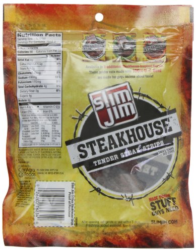 Studio : ConAgra Foods Sales, Inc. Publisher : ConAgra Foods Sales, Inc. Binding : Grocery Product Description Slim Jim is a convenient, one-of-a-kind meat snack, known for its intense flavor. The Slim Jim Steakhouse Beef Strips in Smokin’ Mesquite flavor are made with thick, tender cuts of beef for the ultimate beef snack. Slim Jim offers a full line of beef sticks, snack sticks, and beef jerky. 0