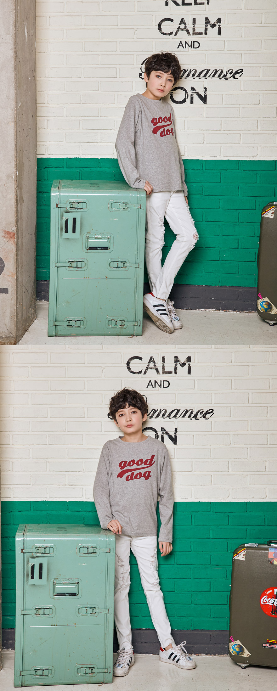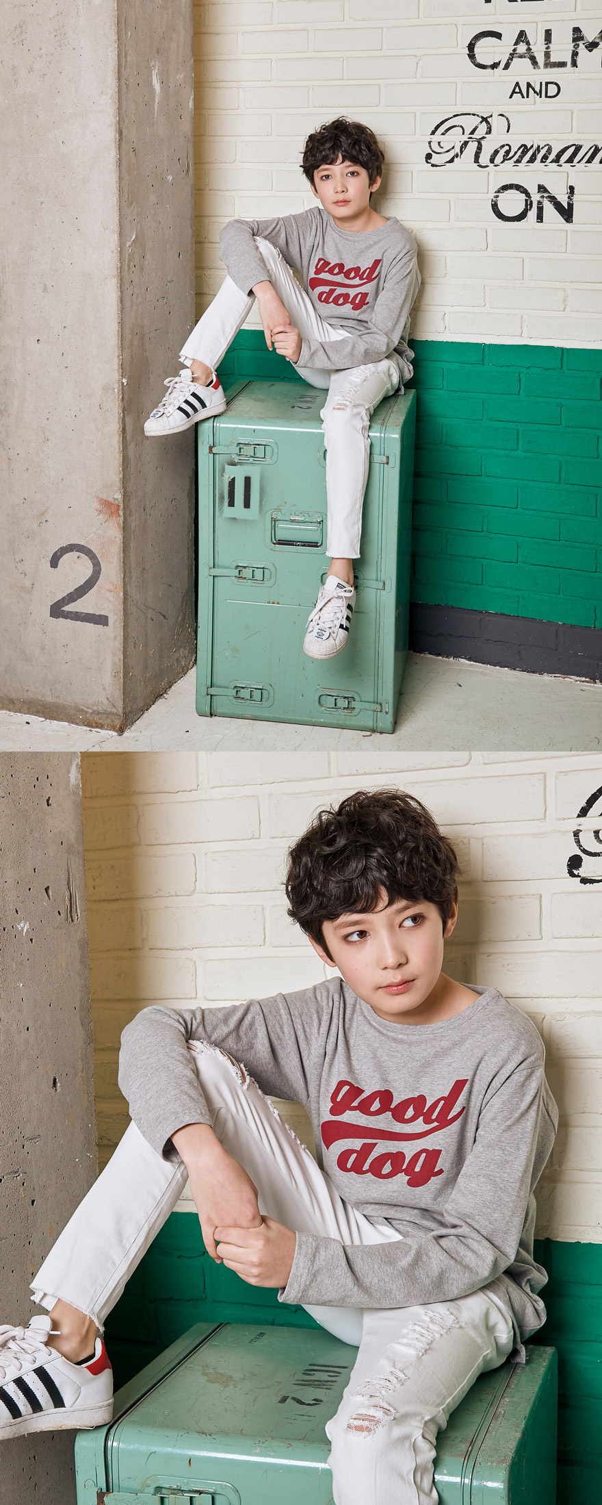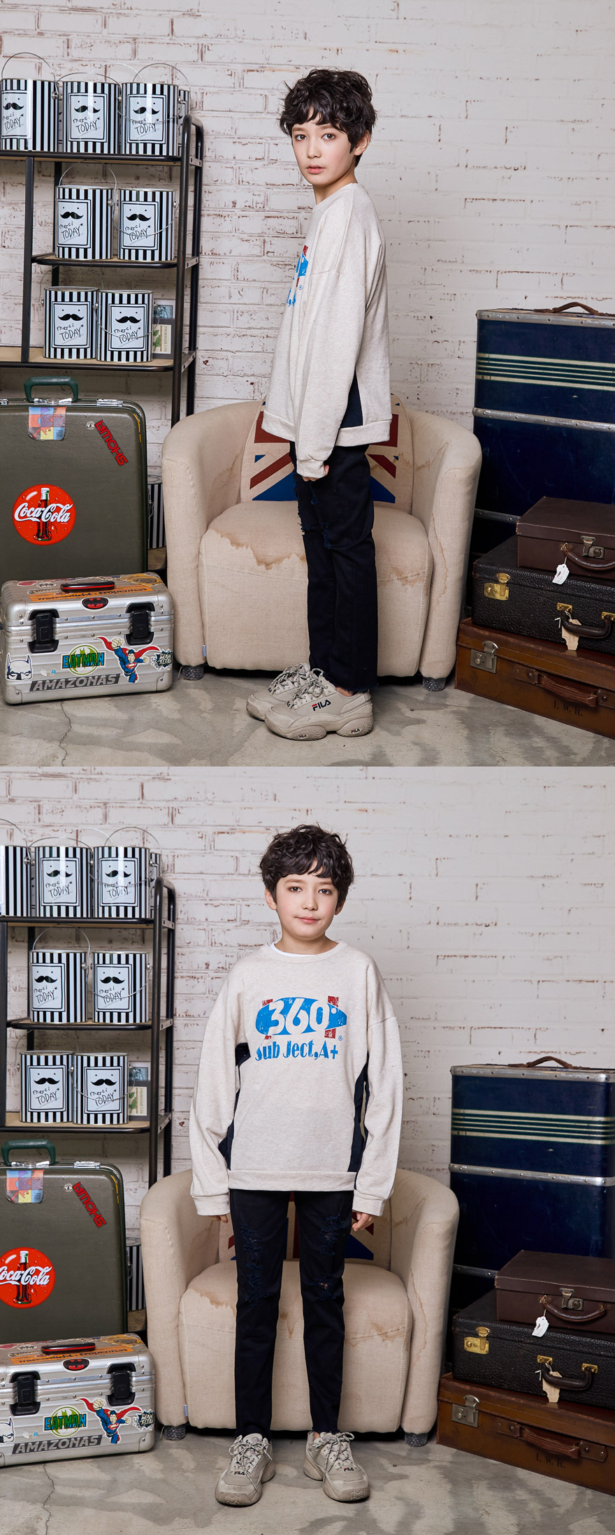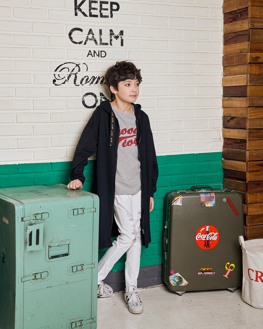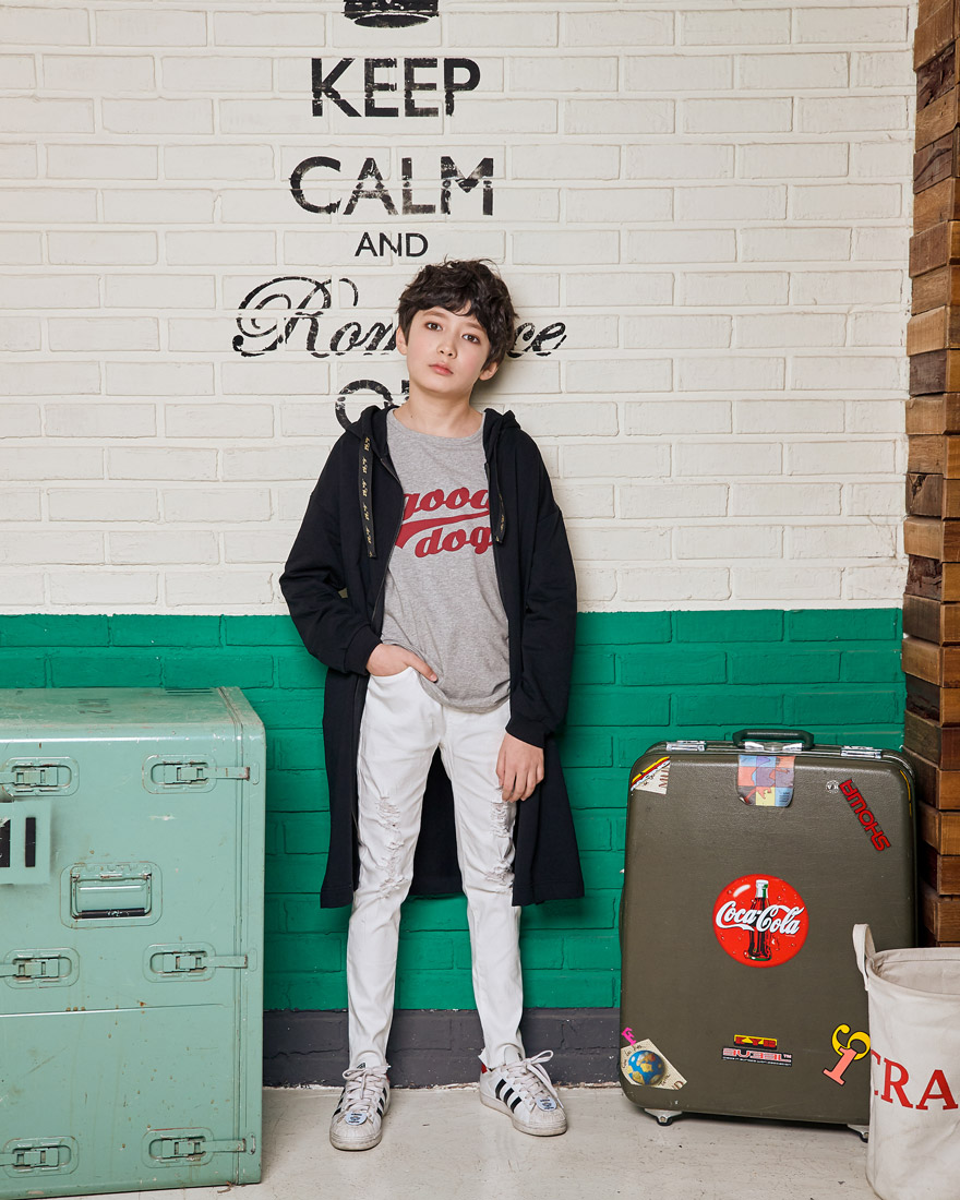 세종이는 151cm에 34kg으로 다소 마른 체격이며, 여유 있게 블랙, 아이보리 15호를 착용하였습니다.