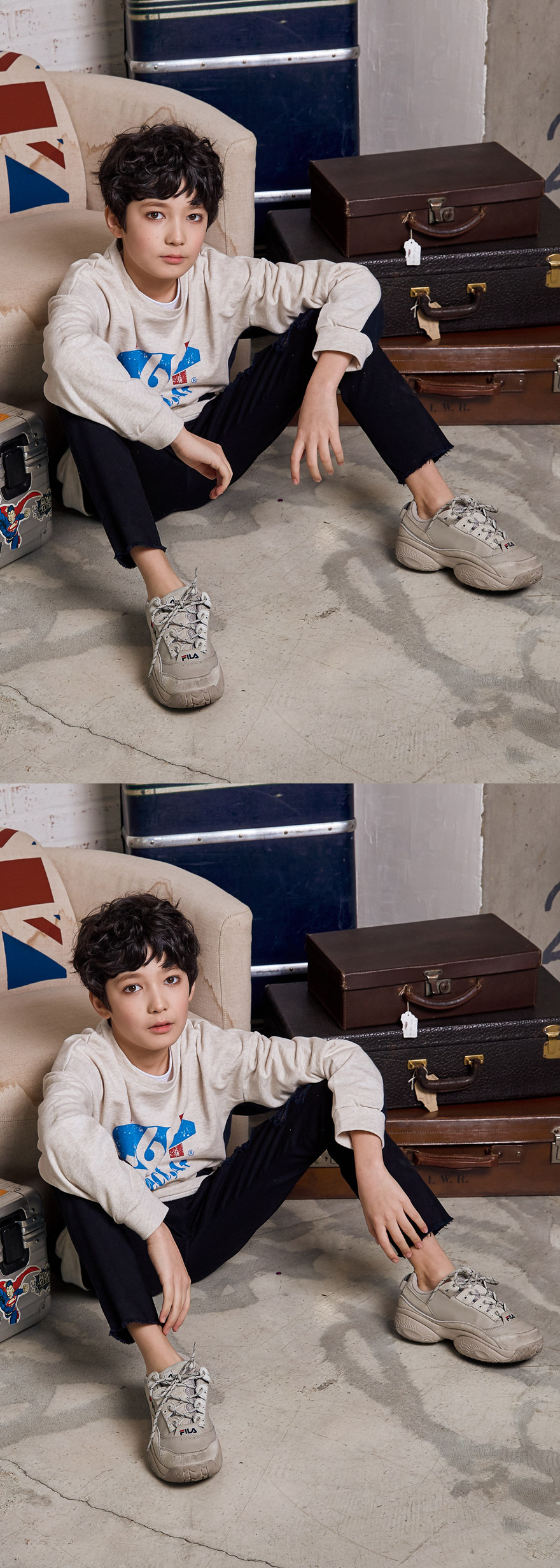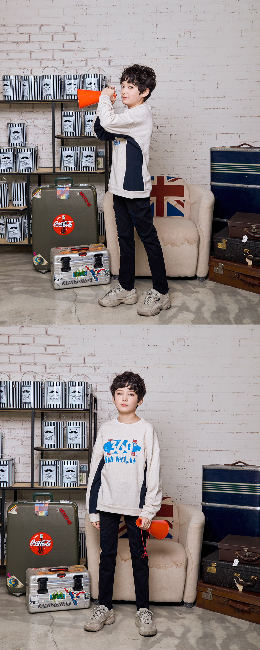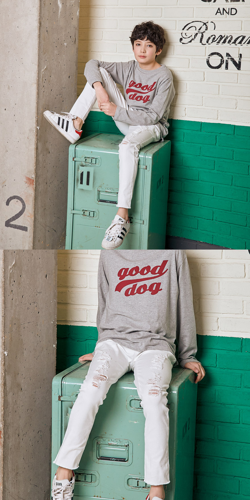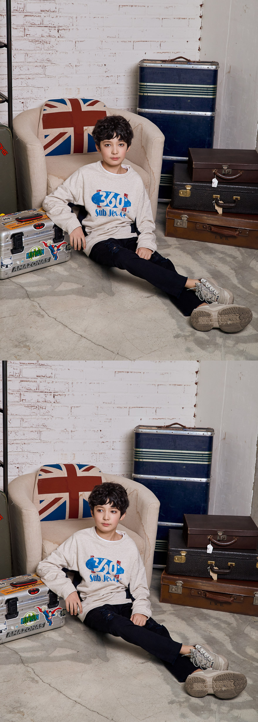 세종이는 151cm에 34kg으로 다소 마른 체격이며, 여유 있게 블랙, 아이보리 15호를 착용하였습니다.