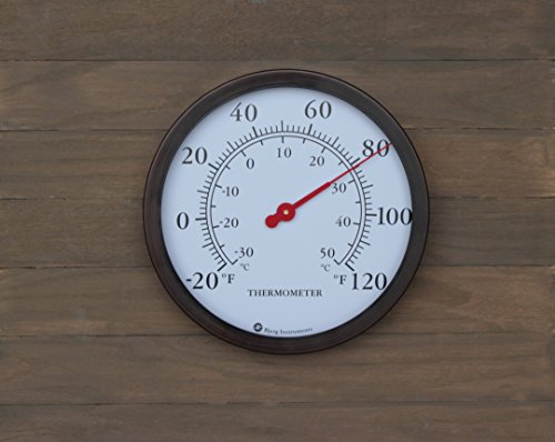 Product DescriptionThis decorative outdoor thermometer has an 12 inch diameter, with an easy to read dial that shows the temperature in both Celsius and Fahrenheit. Sturdy steel construction. Attractive enough to hang indoors or outdoors.0