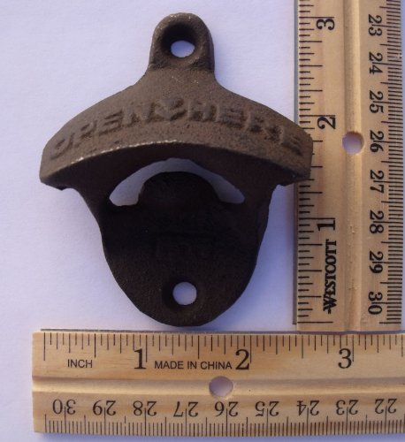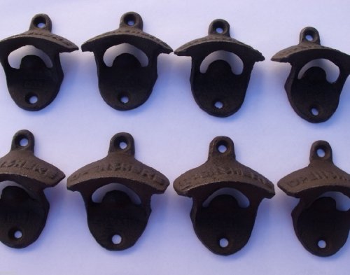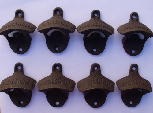 -. Brand : Unbranded -. Color : Brown -. EAN : 0741414291164 -. Feature : Set of 8 Cast iron wall-mounted bottle opener with screws. / Designed to have a rustic or vintage appearance. / Color is brown with black highlights. Color darkness will vary. / Each measures approximately 3-1/8" long by 2 1/2" wide and sets out 1 1/4" from the wall. -. MPN : 10081 -. PartNumber : 10081 -. ProductGroup : Kitchen -. ProductTypeName : KITCHEN -. Title : Set of 8 "Open Here" Cast Iron Wall Mount Bottle Opener Vintage Look Replica -. UPC : 741414291164