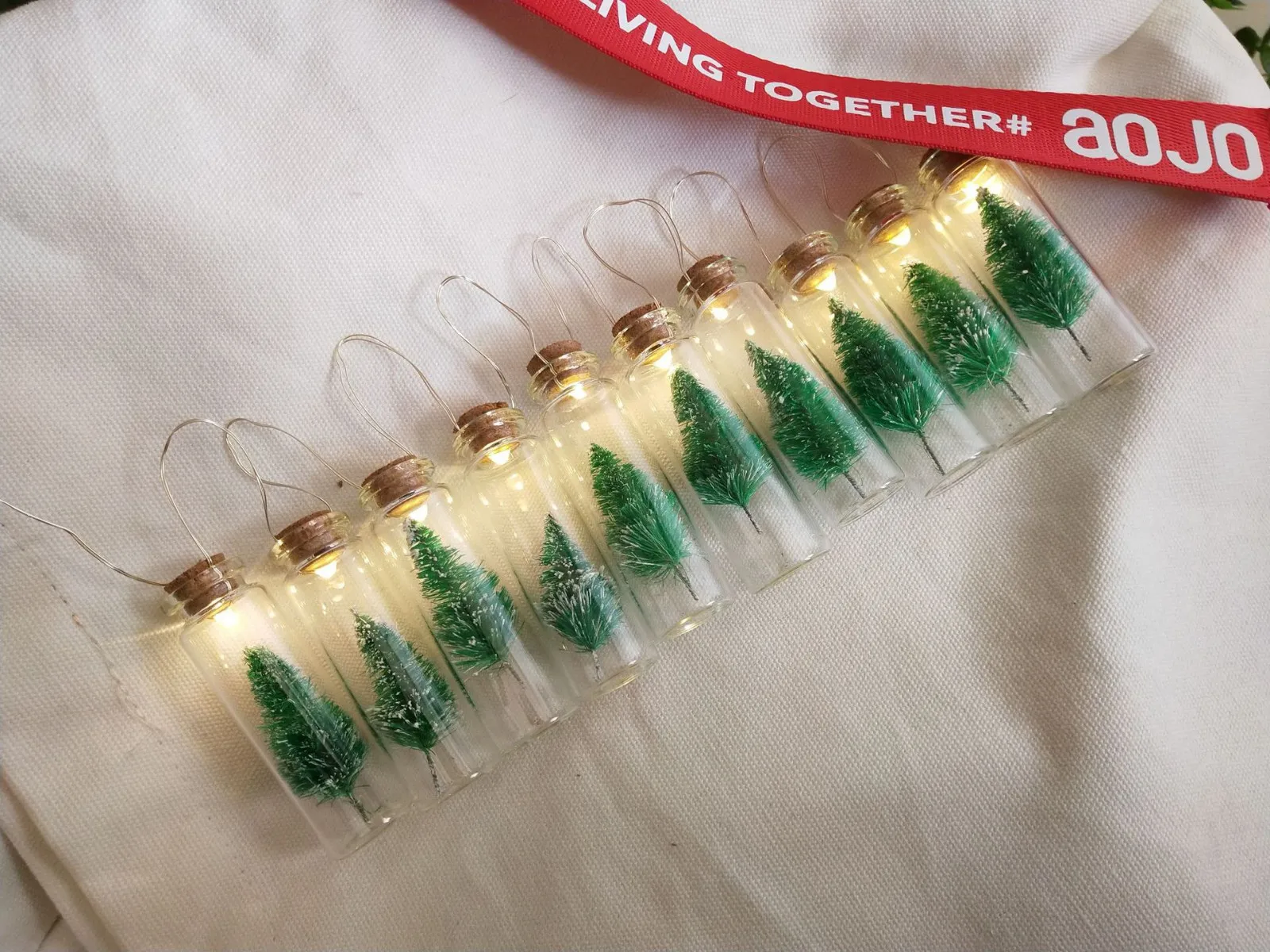 10 glass jars, each with a warm white LED inside with a cork stopper
