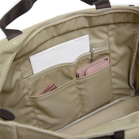 -. Feature : 【表地】ポリエステルキャンバス(エンボス加工) 【裏地】ナイロンツイル / 【付属革】牛デイリーステア(コンビネーションなめし) 【サイズ】W325×H250×D130(mm) / 【重量】約 700グラム 【生産国】日本 / 【外側】スナップ留めポケット(ジップポケット内蔵)、スナップ留めポケット(M)×1 / 【内側】ジップポケット(M)×1、ポケット(S)×2、クッション材入りポケット×1