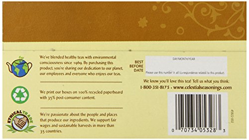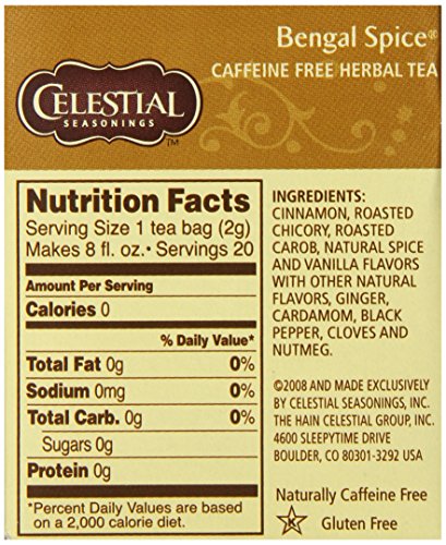-. Artist : Amor Belhom Duo -. Binding : Grocery -. Brand : Celestial Seasonings -. Department : Teas -. EAN : 0070734053283 -. Feature : Disclaimer: This website is for informational purposes only. Always check the actual product label in your possession for the most accurate ingredient information due to product changes or upgrades that may not yet be reflected on our web site. These statements made in this website have not been evaluated by the Food and Drug Administration. The products offered are not intended to diagnose, treat -. IsAdultProduct : 0 -. IsAutographed : 0 -. IsMemorabilia : 0 -. Label : Celestial Seasonings -. LegalDisclaimer : * These statements have not been evaluated by the Food and Drug Administration. This product is not intended to diagnose, treat, cure or prevent any disease. ** Always refer to the manufacturer's label on the product for description, recommended dose and precautions. -. Manufacturer : Celestial Seasonings -. Model : 48885 -. MPN : - -. NumberOfItems : 1 -. PackageQuantity : 1 -. PartNumber : - -. ProductGroup : Grocery -. ProductTypeName : GROCERY -. Publisher : Celestial Seasonings -. ReleaseDate : 2000-04-01 -. Size : 20 -. Studio : Celestial Seasonings -. Title : Celestial Seasonings Bengal Spice Tea, 20 Count, 1.7 Oz