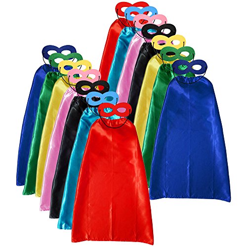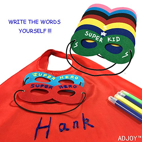 Being a superhero is every child's fantasy. Are your kids big fans of superheroes? Love pretend play with your little ones? Tired of cheaply made and easily torn apart dress up party costumes? If you are nodding,you find right products. ADJOY can provide you the ultimate superhero costume collection for your kids. Make their dreams come true with these fancy little costumes! Design the character you can imagine on the capes and masks,Put on and go to save the world! Everything is Easy. Each Package includes 14 sets of Satin superhero costumes, masks. Any great superheroes can be by your side.You can design your own Batman Superman Spiderman, Capitan America etc as you want. With high quality satin fabric, vibrant colors and adjustable Velcrro-straps, these dress up costumes accommodate even your most demanding needs. Suitable for Halloween trick-or-treating, role playing, birthday parties, party favors, date plays, superhero theme parties, sleepovers, and any other occasion or pretend play that your little one feels like dressing up as a superhero! Ideal for both boys and girls. With ADJOY Superhero Costumes You Kids Could expand their vocabulary and develop language skills! follow the rules, understand concepts, and build empathy. develop problem solving skills and promote critical thinking, ensure cooperation, team work and harmonious interaction with others! learn what's right or wrong, explore moral values, become patient and helpful! Hurry Up to add to cart or you might miss it.Feature