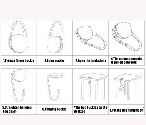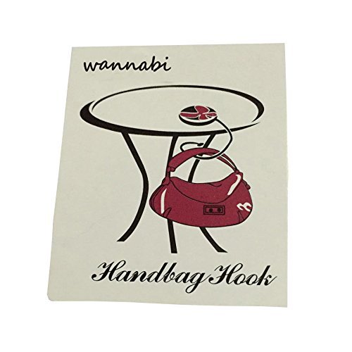 Studio : WannaBi Publisher : WannaBi Binding : Kitchen Product Description PURSE HANGERS! It's always a problem...Where to put your purse when you're eating out at a restaurant. Hang your purse on the back of your chair (easy for someone to slip off). On the floor - under your feet (not very convenient or sanitary ). In your lap? That would get old quick. The most convenient way? Simply hang your Purse Hanger on the edge of the table and hang your purse on the hook. Conveniently holds your purse within "YOUR" easy reach, not the person sitting at the table behind you! Foldable, easy to pack and store. Beautiful adornment to match with your handbags Size: 4 x 1.0 cm / 1.8 x 0.4 inch (Width x Height) when folded. 8 cm / 3 inch (Length) when unfolded. Weight limit: 10 lbs. Package Content : 1 x Handbag Table Hook 0