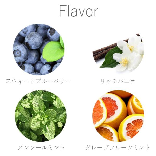 ●フレーバー:リッチバニラ、メンソールミント、スウィートブルーベリー、グレープフルーツミント