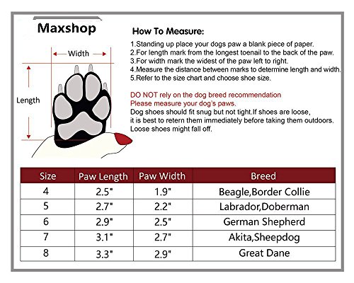Studio : Maxshop Publisher : Maxshop Binding : Misc. Product Description Please carefully refer to the dog shoes size format,Make sure to know the size of your candy dog match the shoes size before purchasing, otherwise the feet would be not comfortable EMERGENCY ADVICE: Shoes are important for protecting your dog's paws from sharp objects during walks, hiking, and even swimming. Many dogs do not like getting their paws wet and the waterproof design helps keep dry and warm. When you get home take off the shoes and keep your floors clean. During the winter shoes can protect their paws from harsh salt on the roads and sidewalks. During the summer the shoes can protect their paws from hot sidewalks, streets, and asphalt. Get your four legged friend a pair of dog boots that are similar to your shoes! How to put on Unfasten the two velcro straps and pull open the boot as wide as possible. Then guide your dog's paw into the shoe and reward them for doing so with a treat. Refasten the velcro straps and pull as tight as comfortable. Your dog may begin to walk funny or even prance at first so get your camera ready, but do not worry this is a completely normal reaction as your four legged friend gets use to their new boots.