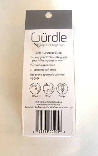 Studio : Parnu Inc. (dba Gurdle) Publisher : Parnu Inc. (dba Gurdle) Binding : Apparel Product Description The gurdle 3-in-1 luggage strap keeps it all together and helps travellers move more efficiently and without mishap. from front porch to international airport, this multi-purpose strap firmly secures your carry-on to your roller-bag hands-free, helps keep your bursting suitcase from, well, bursting, and better identifies your luggage at your destination. construction colors fit dimensions 0