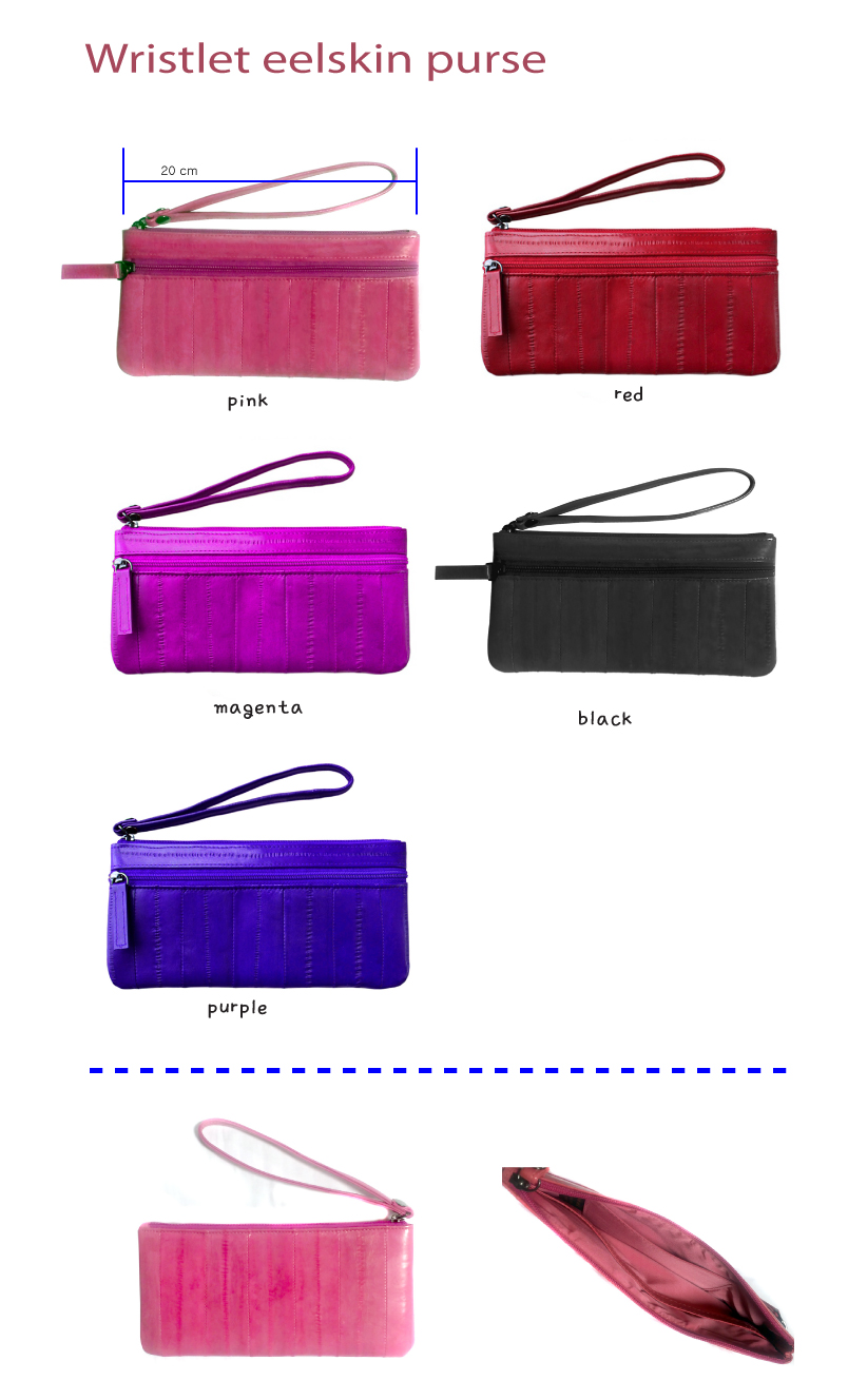 Size : 8”(L)-20cm / 4”(H)-10cm / 0.4”(W)-1cm - Zipper pocket outside - Open pocket inside - Wristlet strap Genuine eel skin leather's characters : - High quality eel skin develops soft supple touch with use. - Handmade and well costructed.