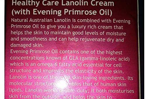 Natural Australian Lanolin is combined with Evening Primrose Oil to give you a luxury rich cream that helps the skin to maintain good levels of moisture and smoothness and can help rejuvenate dry and damaged skin.