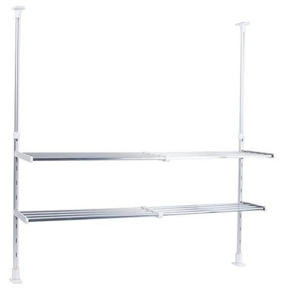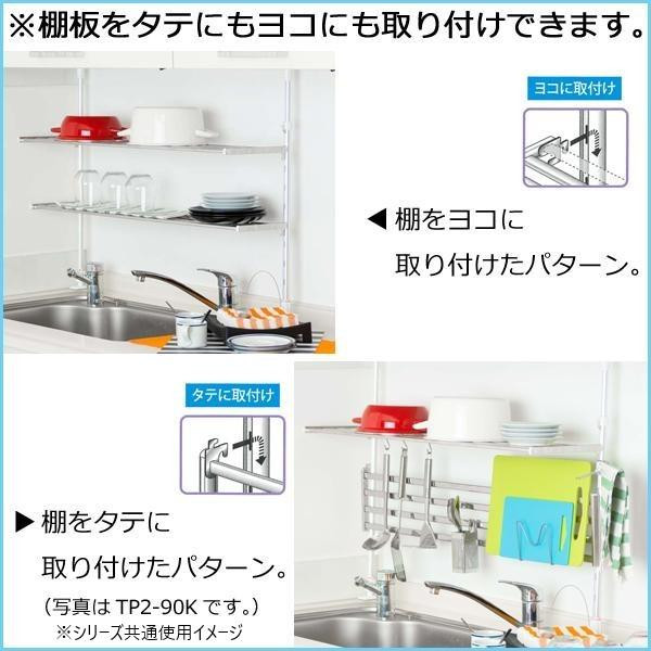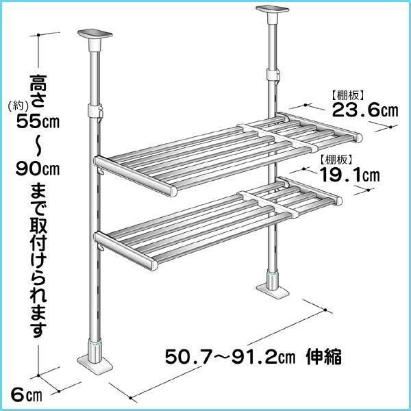 | ワンタッチの「つっぱり支柱」で取り付けも簡単!壁に傷を付けずに取付できる便利なつっぱり棚です。つっぱり支柱の高さは55~90cmの間で調節できます。 |