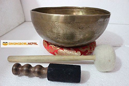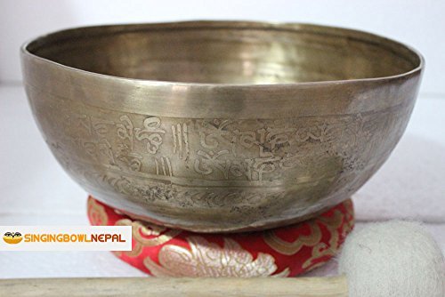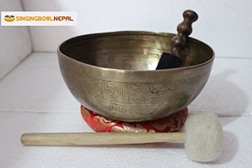 Studio : Singing Bowl Nepal Publisher : Singing Bowl Nepal Product Description 11" F Note Master Healing Mantra Carved Singing Bowl is a special bowl, which is made of seven metals, i.e. gold, silver, copper, iron, tin, lead, and zinc. All the metal used has a specific purpose and represent the sun and the moon and other planets. This bowl can be used for meditation, music, and chakra cleansing. A leather striker is included with this singing bowl and this bowl was hand-hammered in Nepal. This bowl is truly hand made in a traditional way at singing-bowl house .Due to handmade bowl,the surface have several marked of hammered on it. The bowl have long lasting tune which create totally peaceful environment around you . who are looking for real handmade bowl from Himalaya will not be disappointing by this bowl.