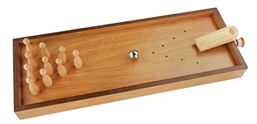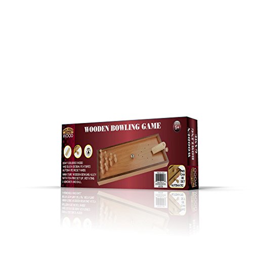 Studio : Real Wood Games Publisher : Real Wood Games Product Description Wooden desktop mini bowling game. Perfect for you to take everywhere to play for fun. Semi-auto pin set up allows you to have more fun playing and less time setting up the pins. Fun game for your kid to train hand-eye coordination and promote relationship through playing. Great for the office as it fits nice on a desk-top. High quality natural wood, without any harmful ingredients. Includes a wooden base, a ramp , ten bowling pins,a metal bowling ball, the ramp is moveable to allow for the perfect strike! . Great for adults or kids! Size: 15.55 x 5.51 x 1.26 inches 0