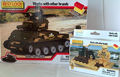 Best-Lock Construction Toys Sherman Tank With Two Figures Combo Set: Over 160 Total Pieces With Bonus Set Of Mini Figures. Build A Lot. Bonus Set Has A Mini Figurine With Gas Mini Figurine And Dog Figurine.