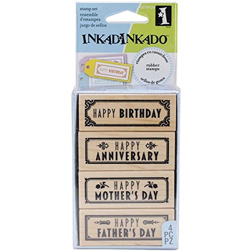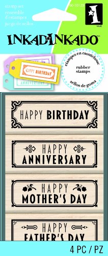 -. Binding : Misc. -. Brand : Inkadinkado -. EAN : 0725718032623 -. Feature : Durable and easy to clean / Stamps crisp, sharp and precise image / Quality wood mounted rubber stamp / Clean your rubber stamps right after using them so that they will always be fresh for the next use / 4-piece wood stamp Set. Each stamp size 2.5 inch by 4 inch -. Label : Inkadinkado -. Manufacturer : Inkadinkado -. Model : 60-10129 -. MPN : I6010129 -. PackageQuantity : 1 -. PartNumber : I6010129 -. ProductGroup : Art and Craft Supply -. ProductTypeName : HOME -. Publisher : Inkadinkado -. Studio : Inkadinkado -. Title : Inkadinkado Wood Stamp, Happy Occasion -. UPC : 725718032623