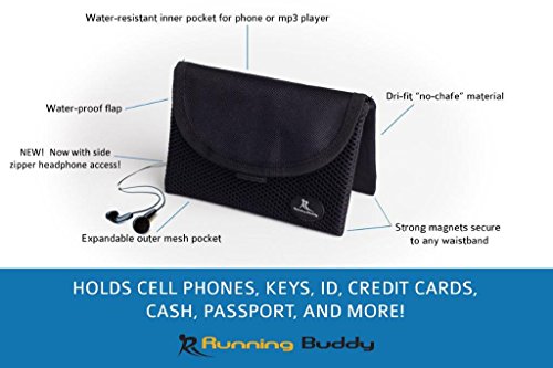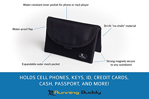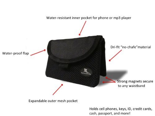 pouch with a water-resistant inner pocket that magnetically connects to any waistband. Made with dri-fit material, the Running Buddy keeps all your running essentials sweat-free and dry. Strong magnets keep the Running Buddy in one place no matter how intense of a pace you're setting!