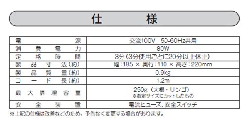 ●전원:AC100V(50/60Hz)●소비전력:80W●정격시간:3분(3분간 사용,20분간 이상 중지)●내려 시간:(무우 약100g)약10초,(사과 약250g)약25초●코드장:1.2m●용기 용량:350ml●최대 조리 용량:250g(무우 사과를 지정크기로 컷 한 것)●안전장치:안전 스위치(상뚜껑이 완전히 꼭 닫혀 있지 않은 상태에서는 전원이 들어 가지 않는다)●힘 있지 않고 편안히 무우 내리기●산마 등 생선구이에 첨부하거나,그러면 청하 # 물건(물품,품질) 어느 무쳐 것에●문질러 내려 사과도 가능●섬유와 내리기즙을 나눌 수 있는(국)즙잘라 플레이트부●스테인레스제 내려 커터