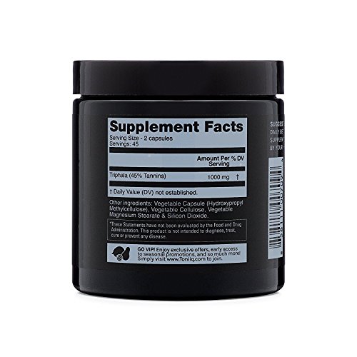 -. Feature : THE AYURVEDIC CLEANSE: Reap the benefits from what has been deemed "The Nectar of Life." Made from the dried powder of three different fruits, Triphala has been traditionally used for thousands of years in Ayurvedic medicine, and is still commonly used today for it's antioxidant, immune-supporting and comfort-promoting properties*. / HIGHEST POTENCY FOR SUPERIOR RESULTS: Toniiq's Triphala has the highest available potency standardized at 45% Tannins per serving (far more than most Triphala available on the market today). Tannins are the best known active compound of Triphala, and have been attributed with numerous health promoting properties linked to its antioxidant activity.* / FAIR TRADE, ORGANIC, ALL NATURAL: Our all-natural triphala is non-GMO, has no additional preservatives and is free of gluten, soy, milk, egg, shellfish, corn, wheat, and peanuts. Made in a FDA registered facility adhering to strict GMP (Good Manufacturing Practices), right here in the USA. / TONIIQ MONEY BACK GUARANTEE: We always hope you're happy with your new Organic Triphala, but if you've had anything less than a first-class experience, we'll refund your money back, no questions asked.