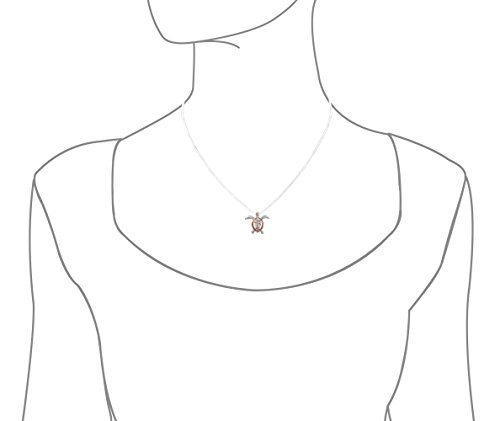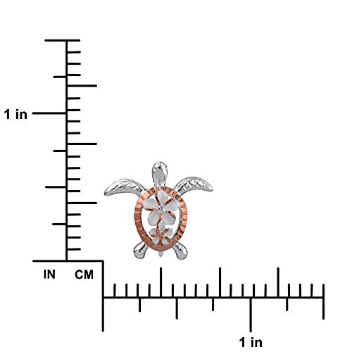 You just can't have enough of honu (turtle in Hawaiian) jewelry! This one is the popular petroglyph style with realistic markings on it's fins and shell and is accented with two sand finish plumerias. The larger, 6mm (diameter) plumeria is adorned with a 1mm synthetic cubic zirconia for that extra sparkle. Bail is hidden in back of it's head for an unobstructed design. 925 sterling silver with 14kt rose gold plated accents. Pendant measures 11/16 inch (0.69 inch) tall and 3/4 inch (0.75 inch) wide and includes a 1mm 16 inch (adjustable to 18 inch) nickel-free sterling silver box chain.Feature