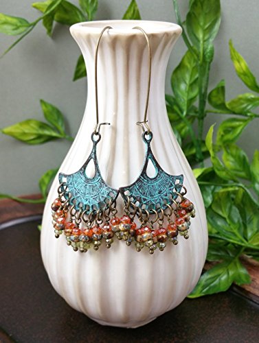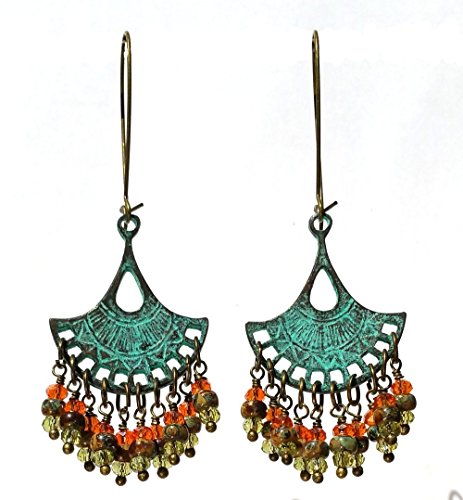 -. Title : 1 Pair of Autumn Breeze Colorful Beaded Chandelier Earrings Gypsy Dangles in colors of Chartreuse Green Tangerine Orange Honey Brown Patina Antique Brass