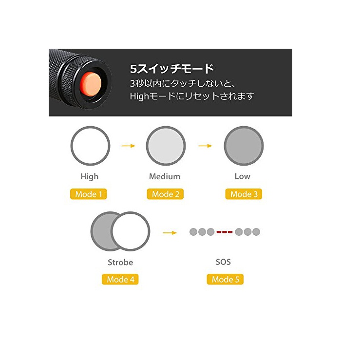 「5모드」:High→Medium→Low→Strobe→SOS.수렵,patrol,동굴 탐험,캠프 등,모든 아웃도어 활동에 최적.