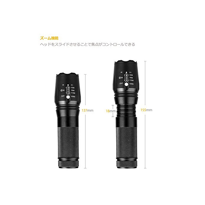 「줌 기능」:본체 헤드부를 슬라이드 시키는 것에,근거리를 광범위하고 비추는 목적으로 한 와이드 빔과,원거리를 보다 멀까지 비추는 스포트 빔을 사용해 나누는 일이 가능합니다.