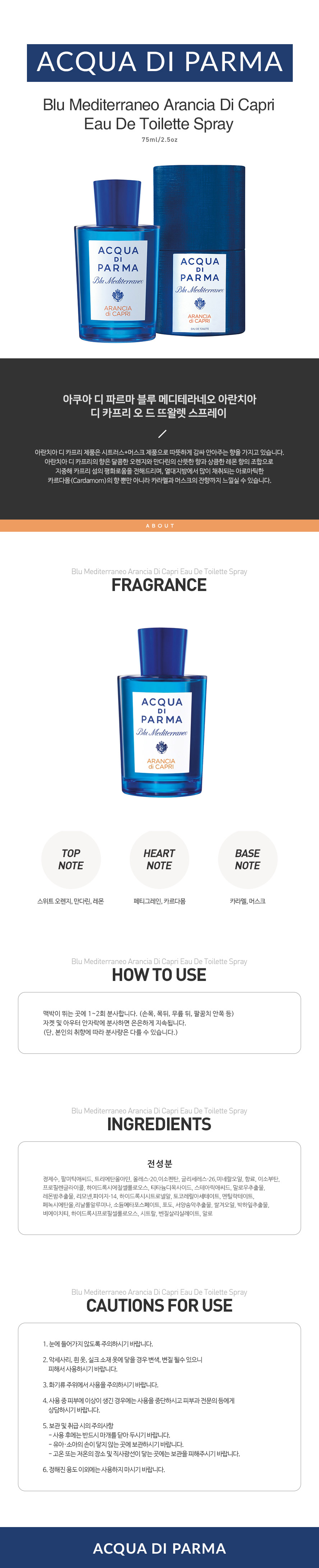 • 카프리 오렌지향이 은은한 향수로 시실리안 만다린 오렌지 카라비안 버가못의 탑노트 쁘띠그랑 카다멈 메이트잎의 미들 노트 무스크 카라멜의 베이스 노트가 어우러진 제품