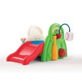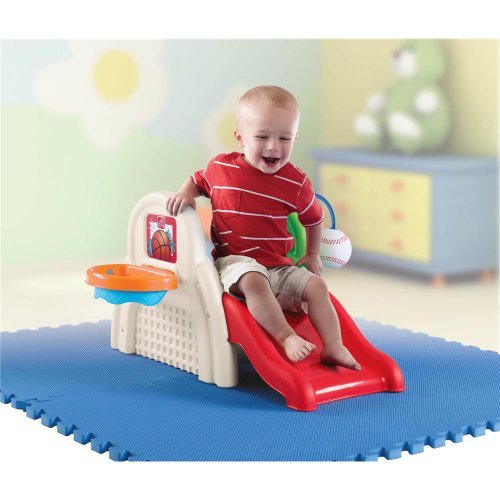 -. Feature : 3-in-1 sports: basketball hoop and ball, soccer goal, tethered baseball and bat / Mini slide and step for active climb and slide play (platform height measures 6.5", 16.5 cm) / Each sports accessory has its own storage place on outer wall / Includes a bat and basketball